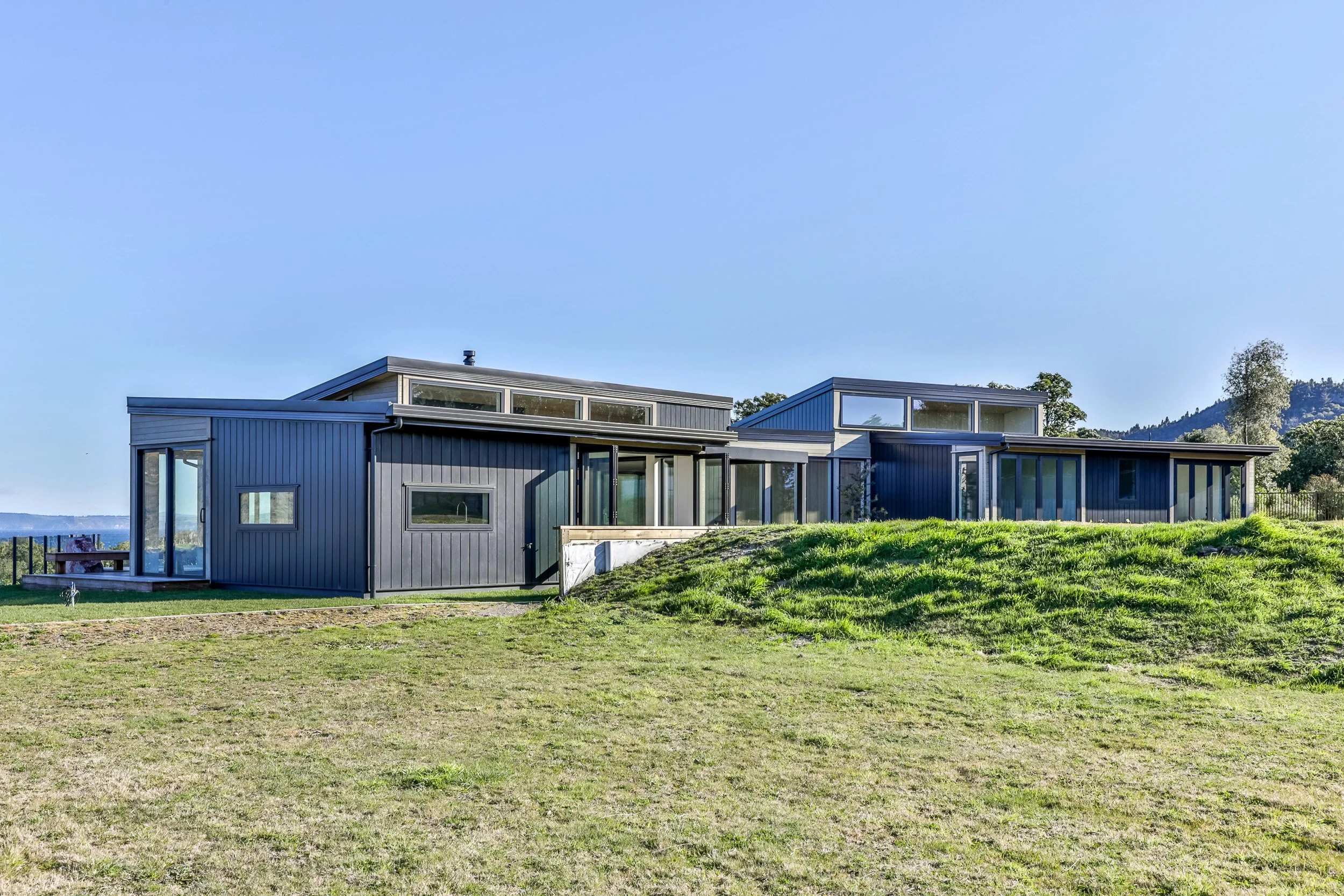 The house is designed on an East/West axis to maximise the southerly views and maintain the sheltered outdoor living on the sunny Northerly side.