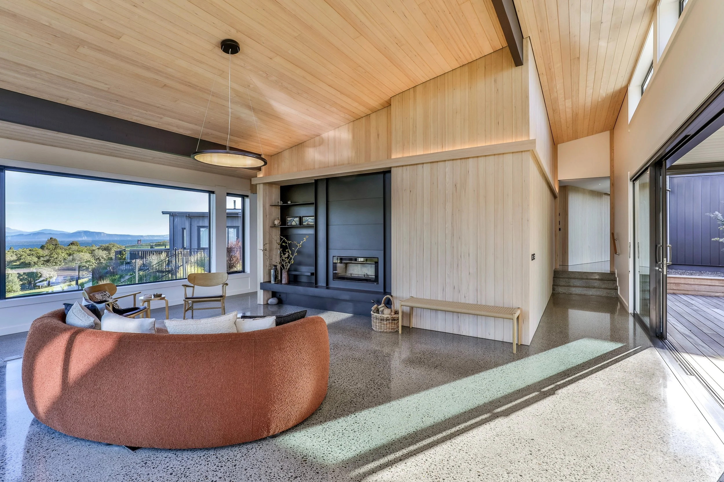 Situated on an elevated site overlooking the stunning Kinloch bay this 275m/2 home elegantly steps down the sloping site with long views down Lake Taupo towards the Tongariro National Park.