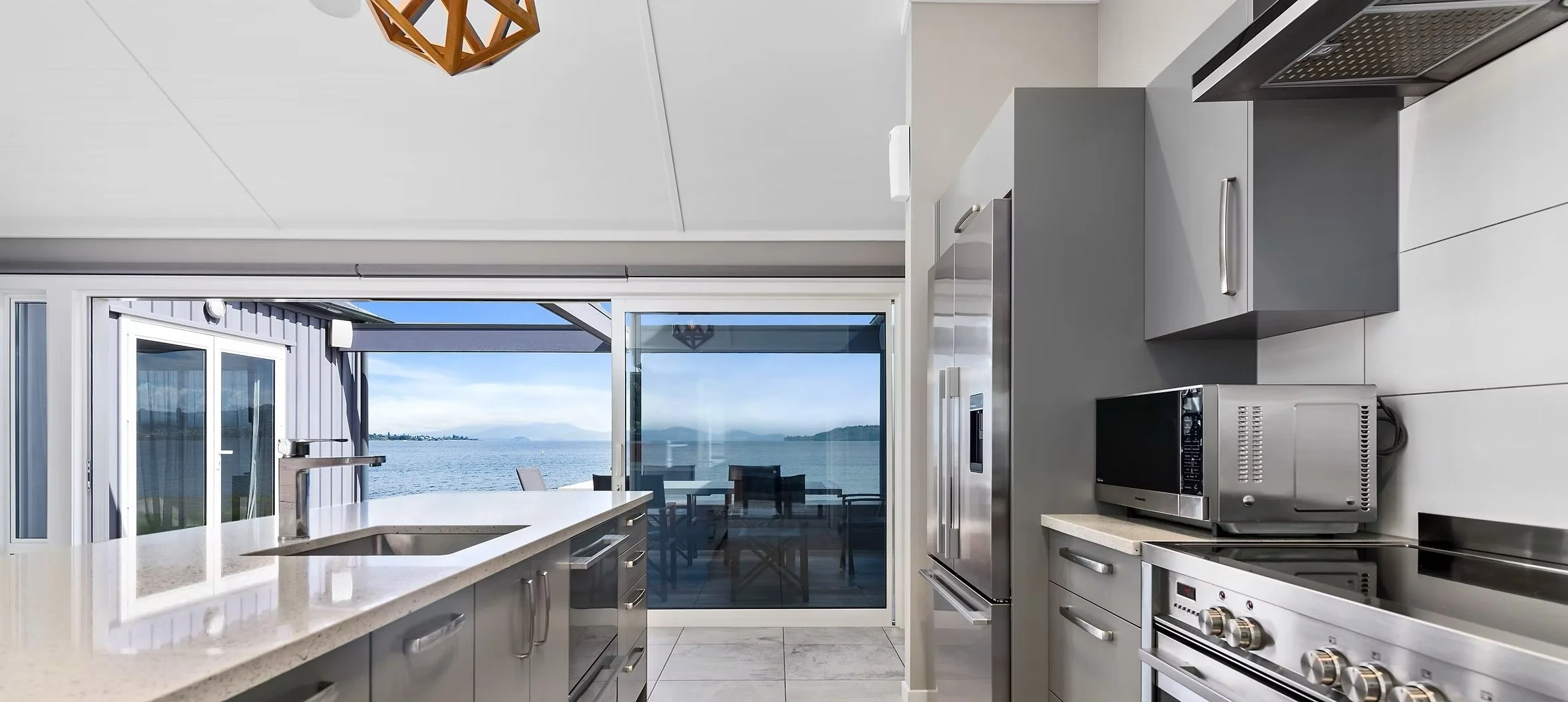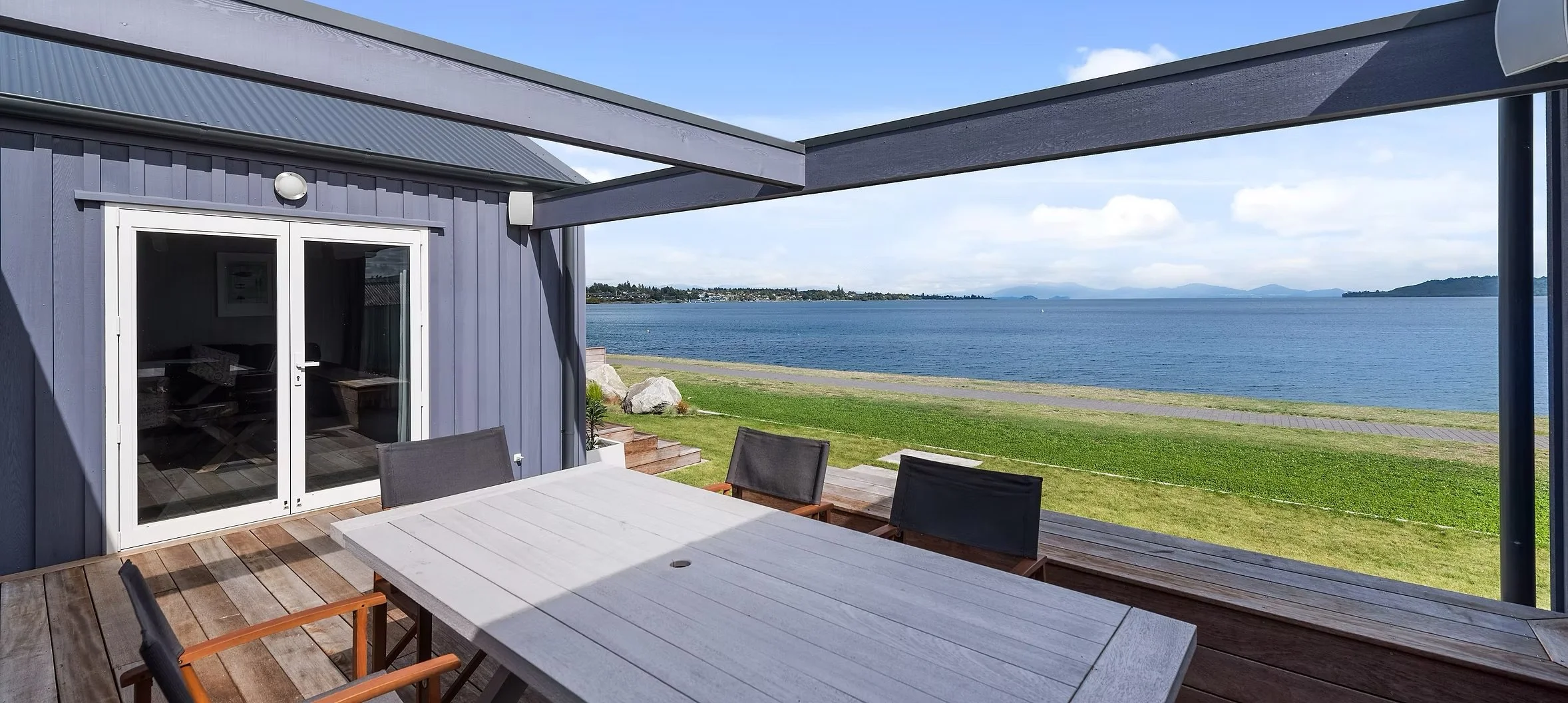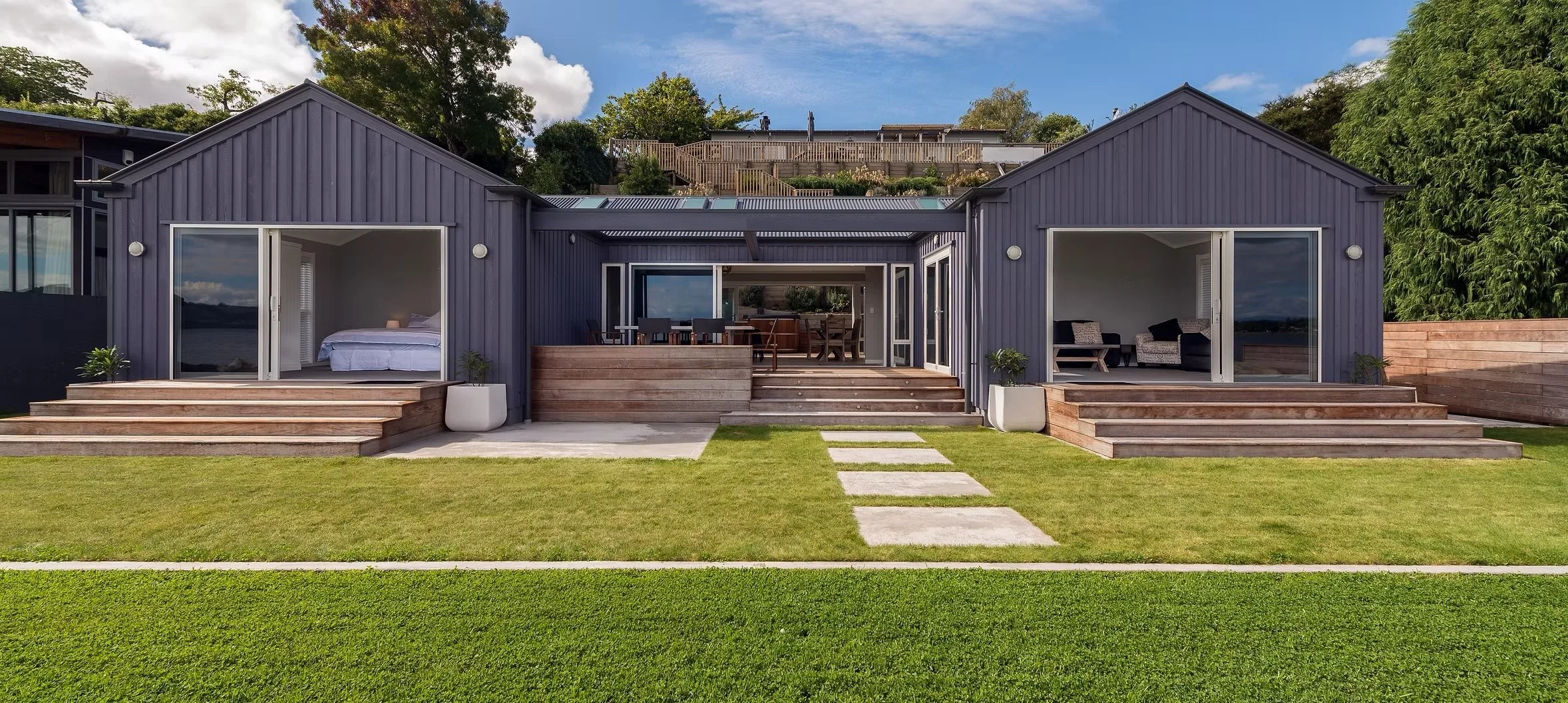 Strolling along the water’s edge of Lake Taupo, you’ll spy two distinctive gable ends that reveal a home with a classic Kiwi boathouse feel.