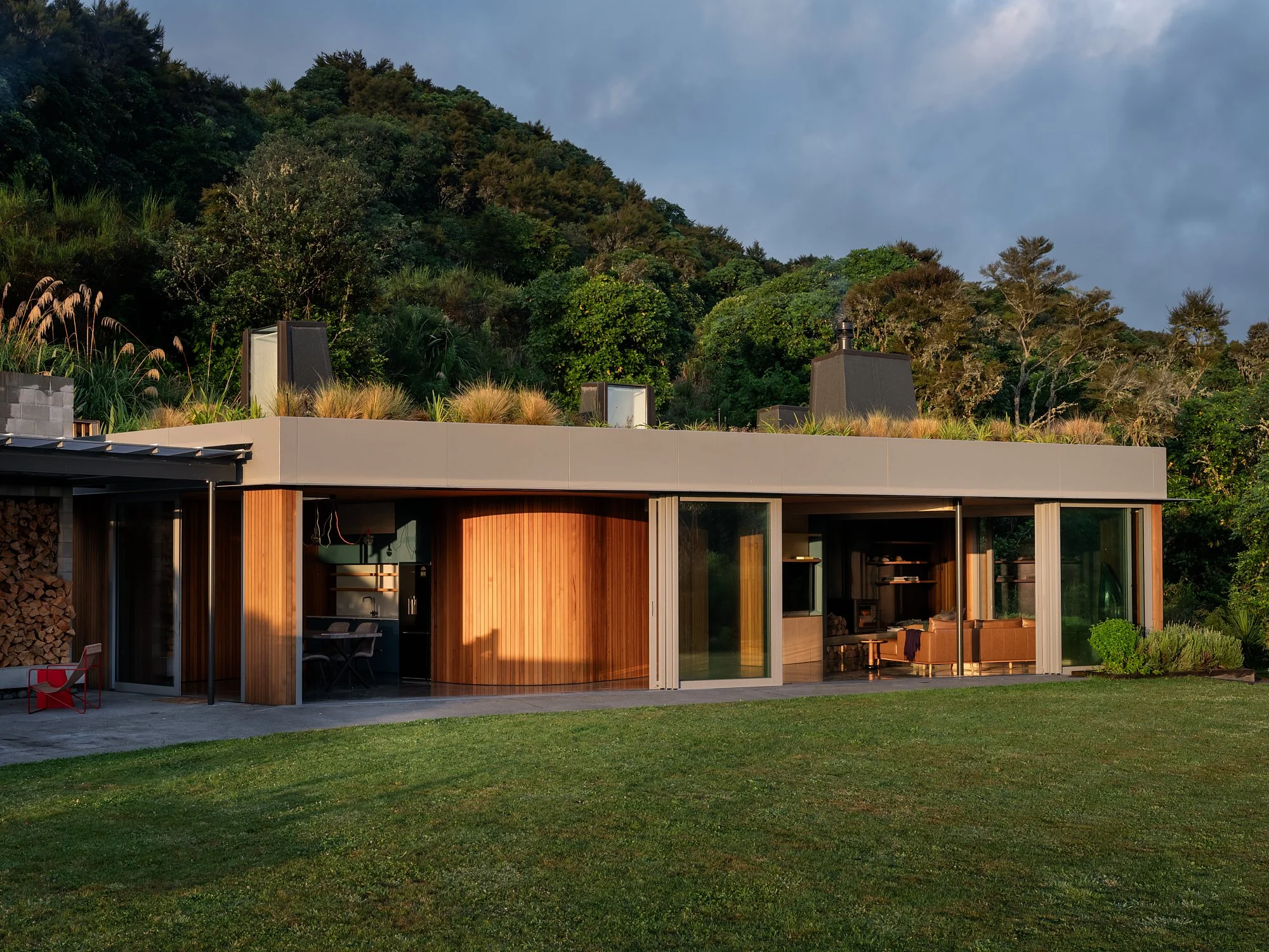 A family retreat tucked into the head of a valley at the south western end of Lake Taupo, Whareroa is a home away from home for a busy family – and at times a meeting place for extended family and friends to gather, fish and enjoy a slower pace of life. The building is tucked into the hillside, neatly mimicking the angles and orientation of site's shape. It opens out to the north, to the native forest to the west, and offers bright flashes of Lake Taupo to the east.